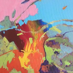 Le bleu comme un parti pris, en regard à la nature, utilisé ici en fond, mais aussi contribuant à faire-valoir les couleurs que je considère vivantes et bienfaitrices ; disposées ainsi, celles-ci suggèrent le mouvement.