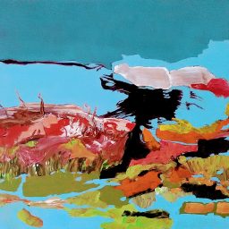 Le bleu comme un parti pris, en regard à la nature, utilisé ici en fond, mais aussi contribuant à faire-valoir les couleurs que je considère vivantes et bienfaitrices ; disposées ainsi, celles-ci suggèrent le mouvement.